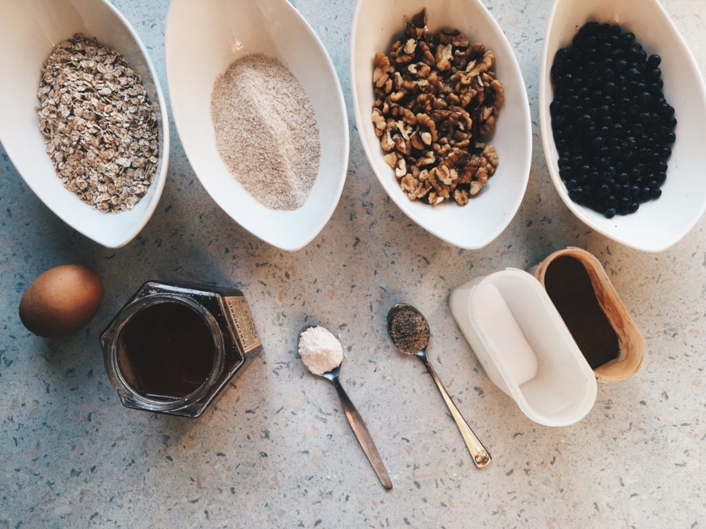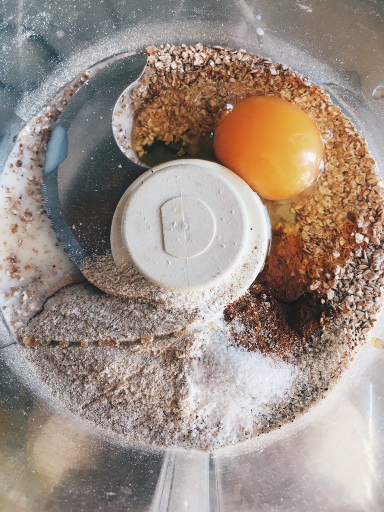1. Zuerst die Haferflocken im Mixer fein mahlen. Anschließend mit dem Mehl und Backpulver, Zimt und Salz vermischen.