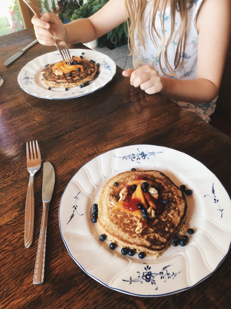 Heute übernachtete meine kleine Cousine Hanna bei mir und da sie immer noch im Bett vor sich hinschlummert, habe ich mir schon Gedanken über ein tolles Frühstück für sie gemacht. Ich denke mit Pancakes habe ich sie an meiner Seite und deshalb widmen wir uns dem Rezept. Wenn ich Pancakes zubereite, dann mache ich immer einen Palatschinkenteig, aber mit weniger Milch, damit der Teig in der Pfanne nicht auseinanderrinnt und man dadurch einen kleinen und hohen Pancake erzielt. Ich möchte eine gesunde Variante zubereiten und entscheide mich daher für 50% Haferflocken und 50% Vollkornmehl. Statt dem Süßungsmittel gibt es einen Esslöffel Honig und für die Würzigkeit 1 Prise Zimt.