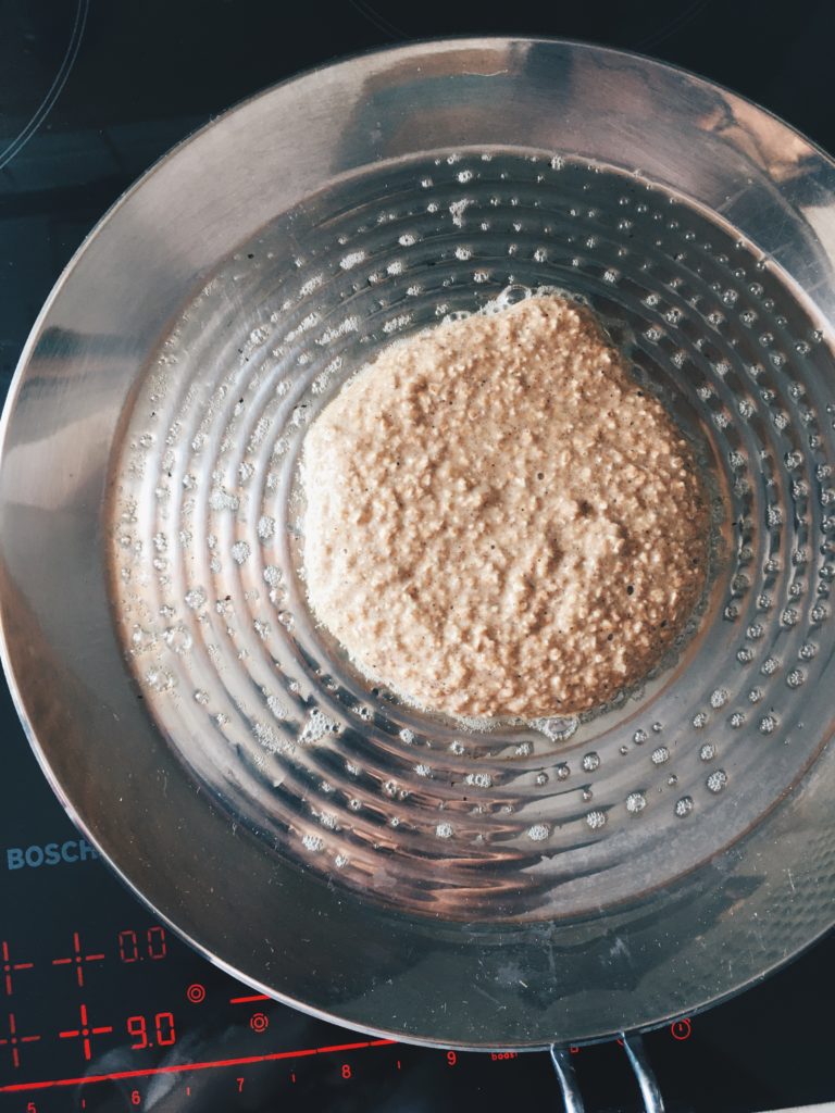 4. Anschließend wird in einer beschichteten Pfanne 1 TL Butter/Öl gegeben und mit einem Schöpflöffel etwas Teig in die Mitte der Pfanne gegeben.