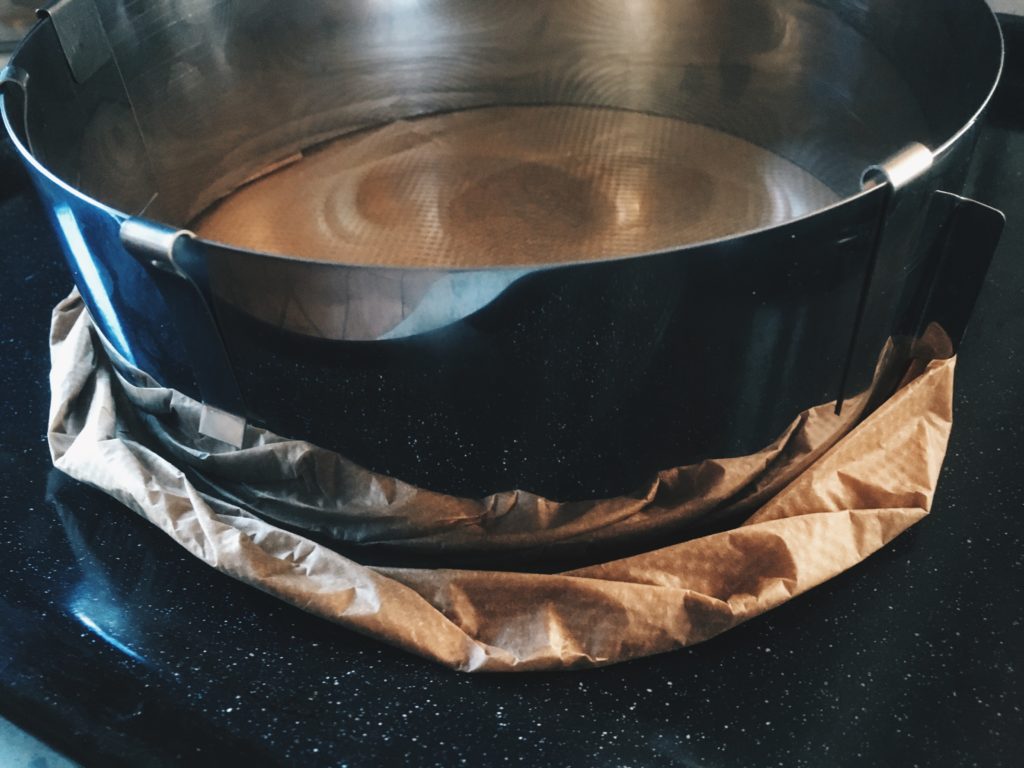 - Als nächsten Schritt wird ein Backring auf 20 cm eingestellt und mit Backpapier ausgelegt.