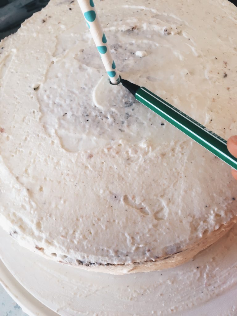 Tipp: Wenn ihr keine O-Platte für den 2. Stock habt, könnt ihr auch einen Karton mit denselben Durchmesser wie die Torte ausschneiden und in Frischhaltefolie wickeln.