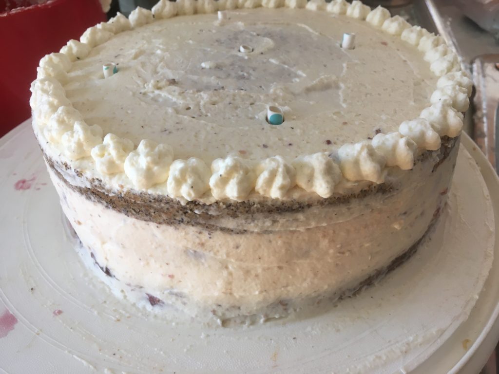 - Nun wird die restliche Creme auf die Torten gegeben und mit einer Palette verstrichen. An der horizontalen Tortenoberfläche sollte kein Tortenboden mehr zu sehen sein und auf der vertikalen sollten die Tortenböden leicht zum Vorschein kommen, um den „Naked Cake“-Stil zu erreichen.