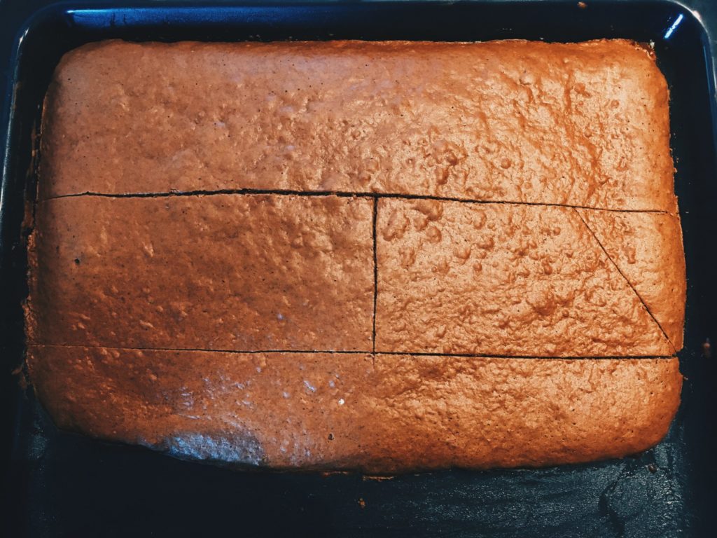 8. Dies wird nun in ein mit Backpapier ausgelegtem Backblech gefüllt und bei 180°C 30 Minuten lang gebacken.