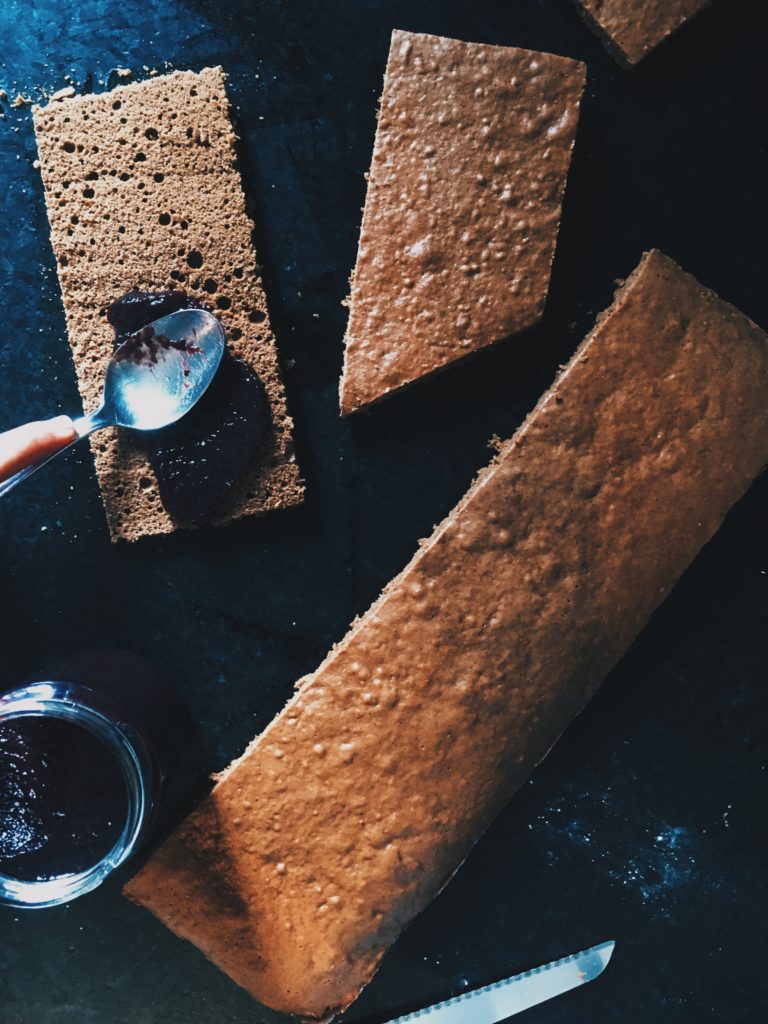 14. Auf die Böden wird nun die Brombeermarmelade mit einem Löffel verstrichen und darauf kommt eine Hälfte der Creme.