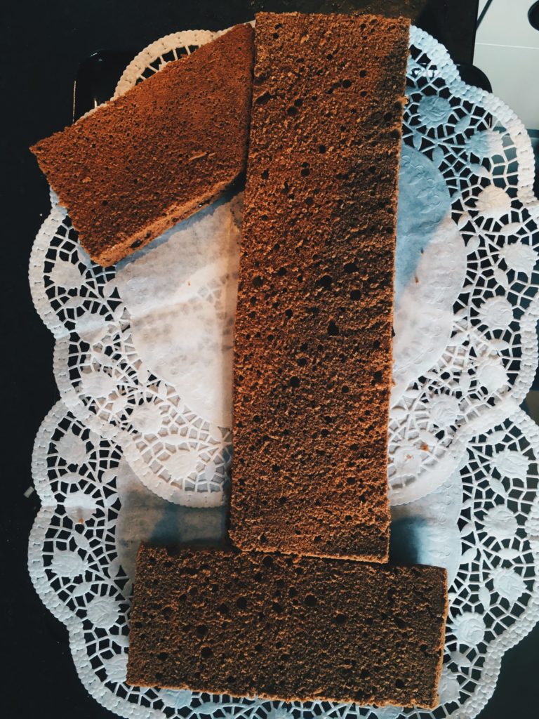 13. Anschließend wird der Kuchen eingeschnitten (siehe Foto) und 1cm vom Rand weggeschnitten. Diese Teile werden nocheinmal horizontal halbiert -> somit hat jedes Teil einen Boden und einen Deckel.